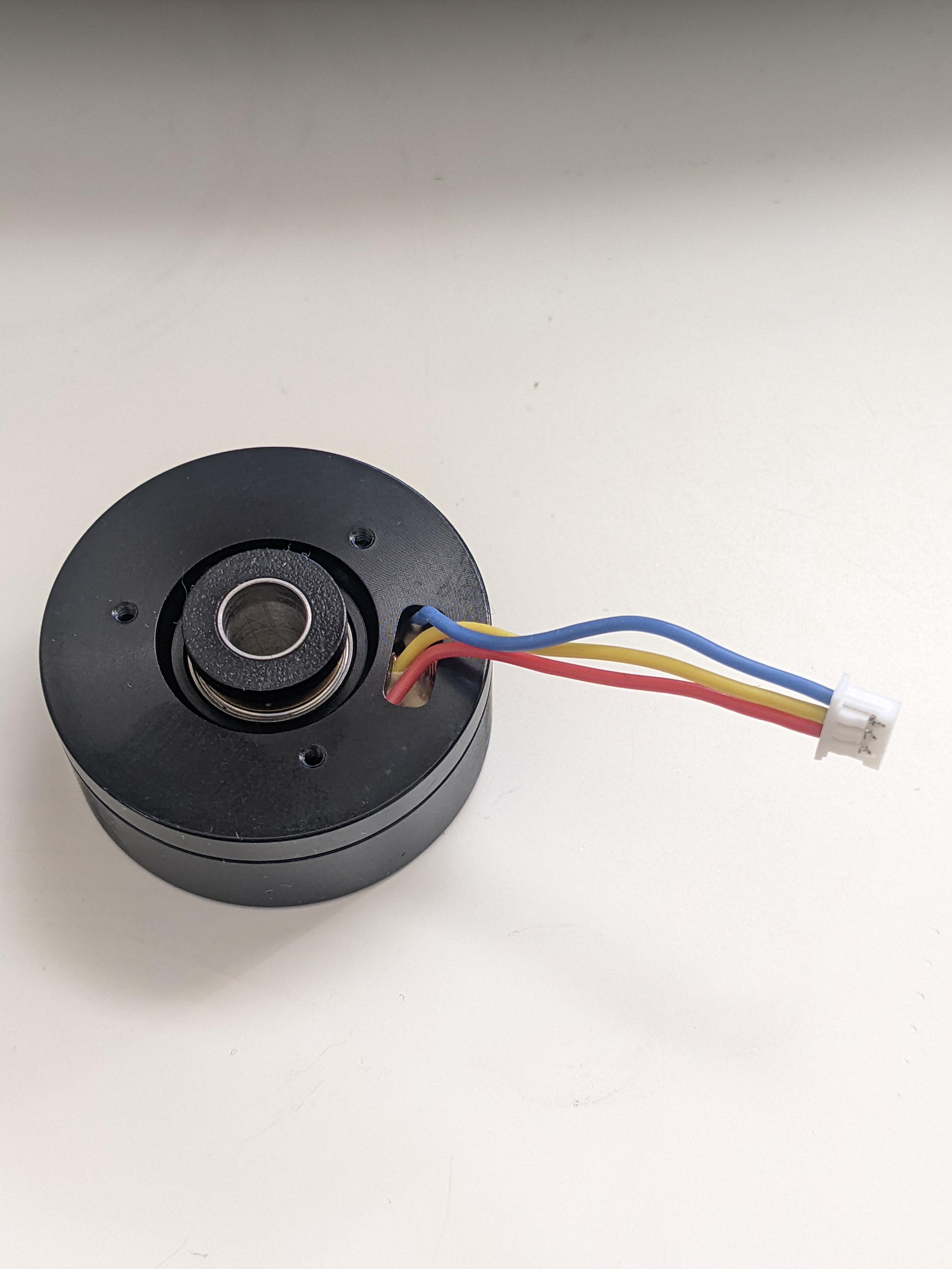 A brushless gimbal motor is paired with a magnetic encoder to provide closed-loop torque feedback control, making it possible to dynamically create and adjust the feel of detents and endstops.