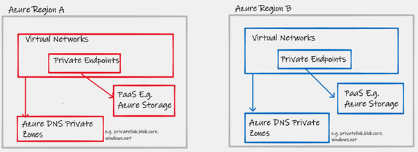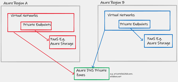 - For each Azure PaaS service (E.g. Azure Storage) you have a single global Azure DNS Private Zone that is linked to your VNets in all regions. Two regions = one Azure DNS Private Zones for Azure Storage, one Azure DNS Private Zones for Azure SQL, etc