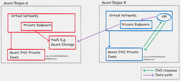 E.g. In the diagram below, a Virtual Machine in Region B is attempting to access a PaaS resource that happens to be located in Region A. By utilising a regional Azure DNS Private Zone, and regional Private Endpoints, the A record that is returned represents an IP address within the local region. This ensures ingress into Private Link as close to the source as possible. The section of the purple data path line that transits between Azure Regions is then entirely handled by the underlying Azure platform, with no dependencies on the customer-managed routing domain or private network.