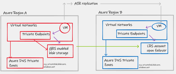 - Using the Blue regional specific Azure DNS Private Zone, a local IP address is returned via a unique blue A record, directing traffic to the local Private Endpoint, which then provides seamless access to the same storage account (Which is now an LRS account hosted in Region B after failover, with the same primary FQDN for access)