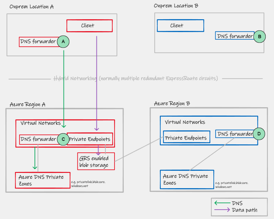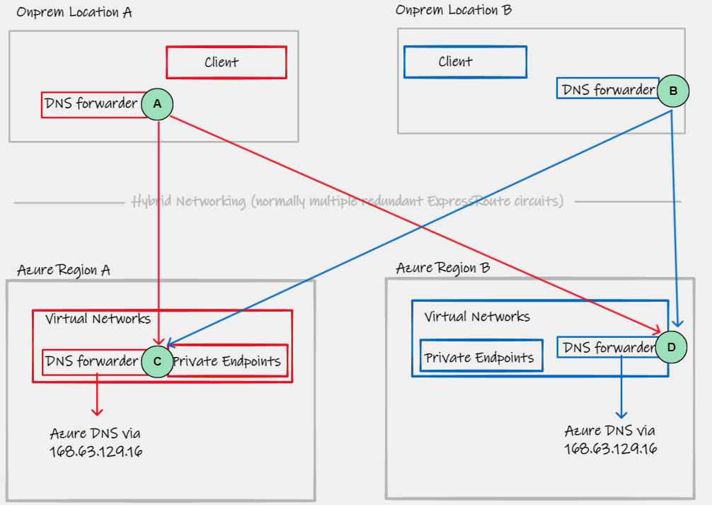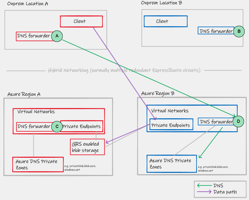 ⚠️ #2⚠️ An important implication of this design is that both your red and blue regions, need Private Endpoints and Azure DNS Private Zone entries for all red and blue PaaS services. Why? If A forward to D, despite D being in Blue, it must have an answer for FQDN/endpoints that live in Red, otherwise you will get NXDOMAIN and break your On-Prem > Azure PL connectivity. This represents a large requirement to update existing automation; I.e. When provisioning Private Endpoints in Red/Blue, your automation must synchronize the intent across regions in the form of multiple PE + multiple Private-DNS zone entries.