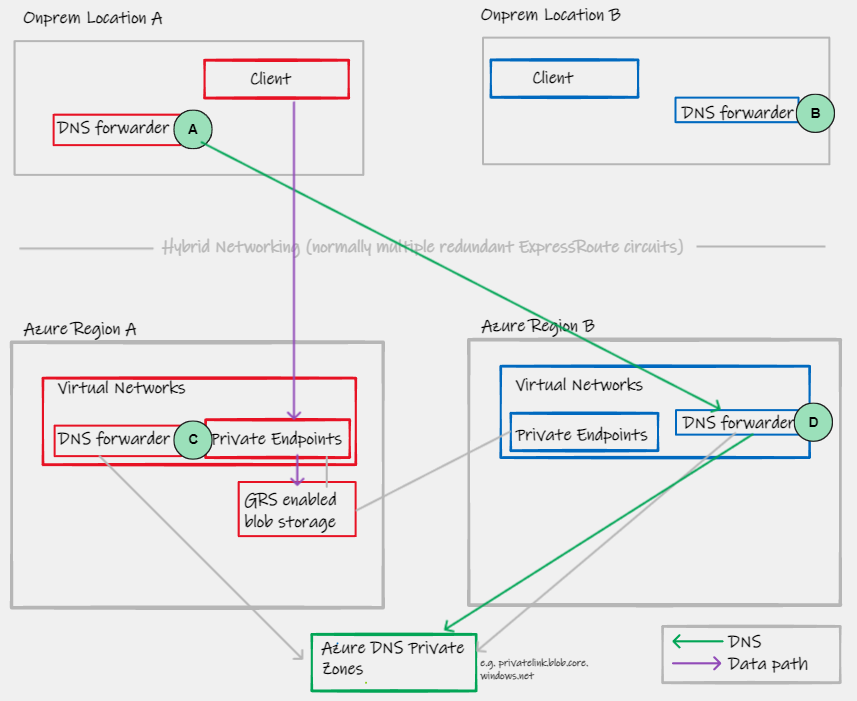 Let us first consider a typical resilient hybrid DNS forwarding design for an Enterprise customer with multiple On-Premises locations, and multiple Azure regions.