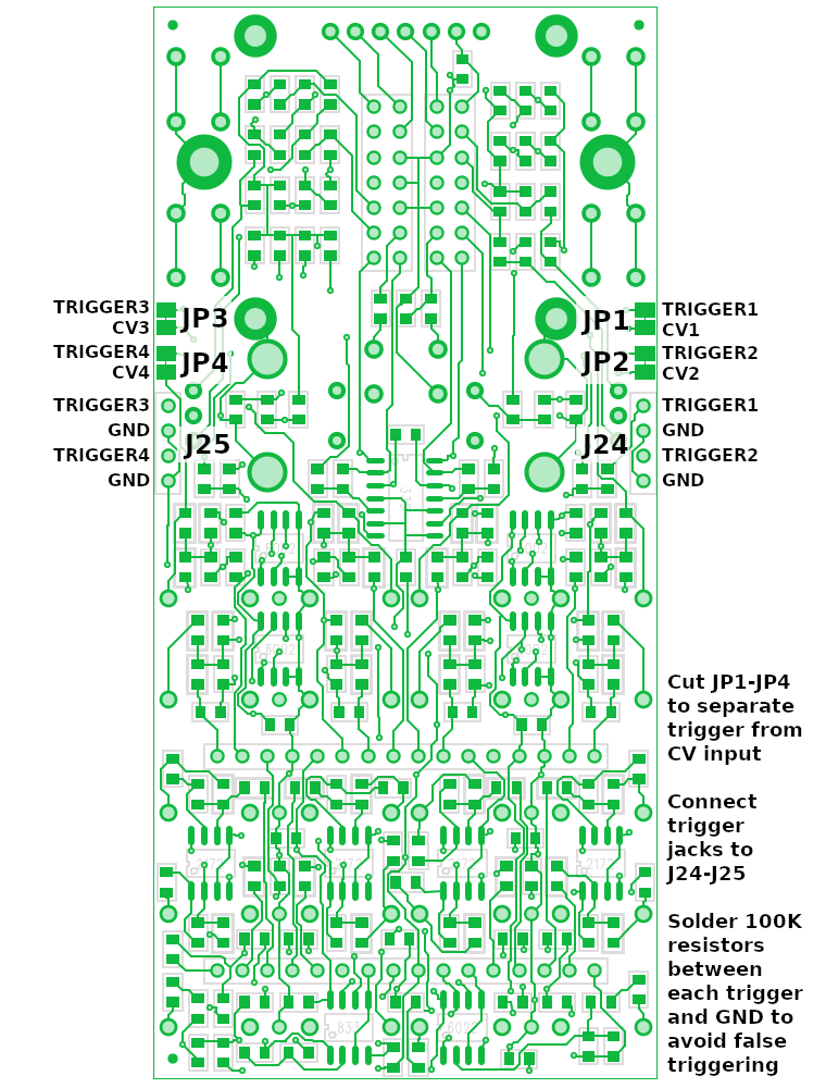 Cut JP1-JP4 apart to disconnect the triggers from CV1-CV4. Then wire external trigger jacks to J24 and J25. 100K resistors are also recommended between each trigger input and GND, to prevent false triggering when the cable is "floating".