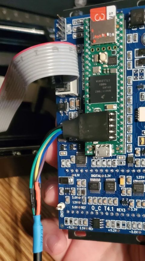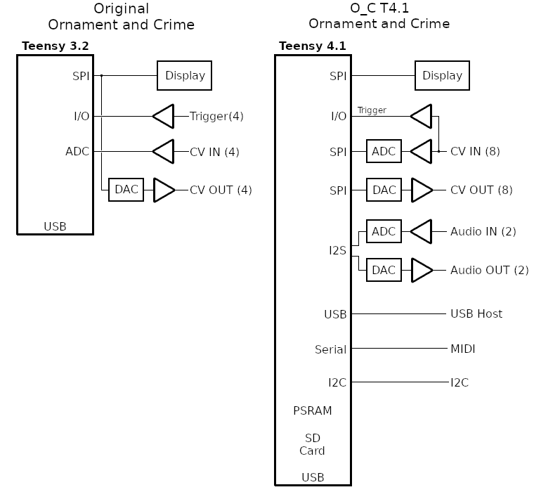 Additional memory can be added to Teensy 4.1, in the form of a PSRAM chip give extra memory useful for audio effects, and a SD card for non-volatile storage. As with everything else, these have fully independent bandwidth. Everything has optimal access for Teensy 4.1. Phazerville leverages optimized drivers with Direct Memory Access (DMA) for all of these peripherals. O_C T4.1 truly is optimized to let Ornament and Crime make the most of the powerful Teensy 4.1 processor!
