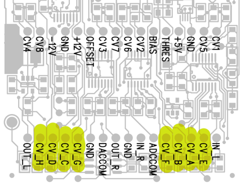 If your CV outputs are not working properly, voltage passed between the front analog board and the back side control board can be measured.