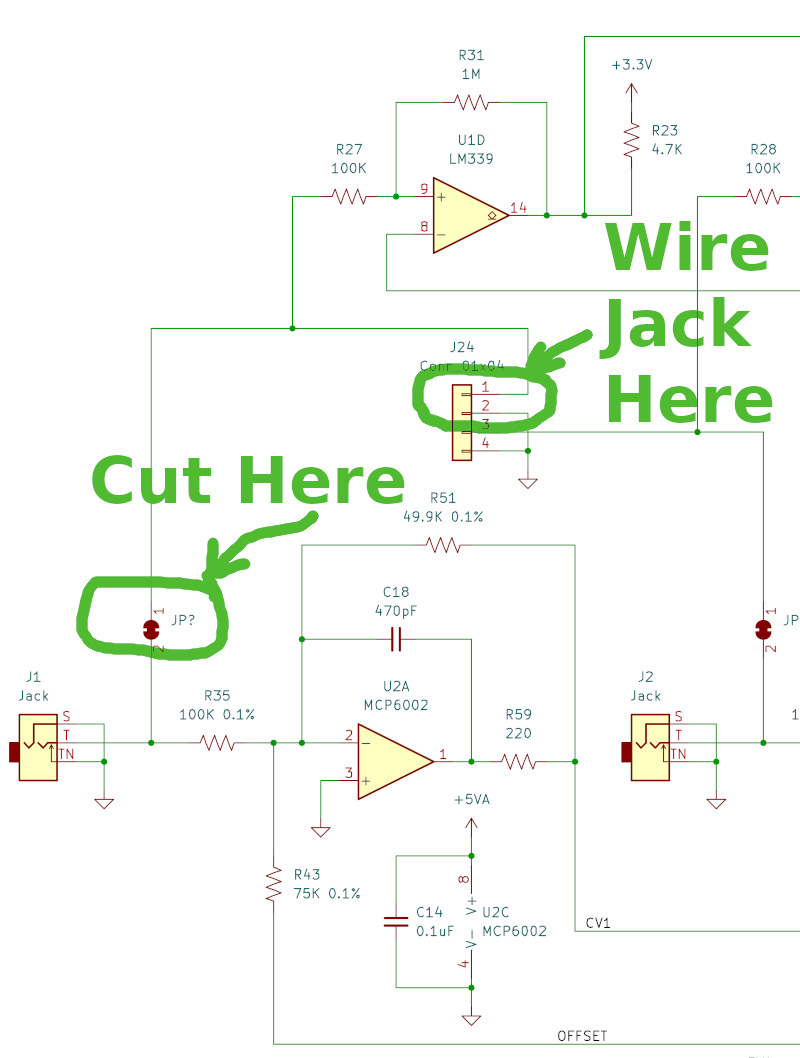 Optionally R201 can be soldered to modify CV input voltage range. Normally this modification would be used with Squares and Circles firmware.