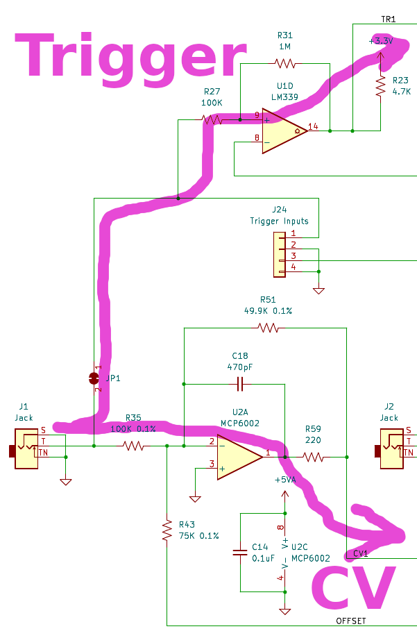 Analog CV Input Offset: All CV input amplifiers on the analog board use this offset voltage to convert Control Voltage which can be positive or negative to the positive-only range of the ADC input chips (U17 and U18). It is created from 2.5V REF by U26, R135, R138.
