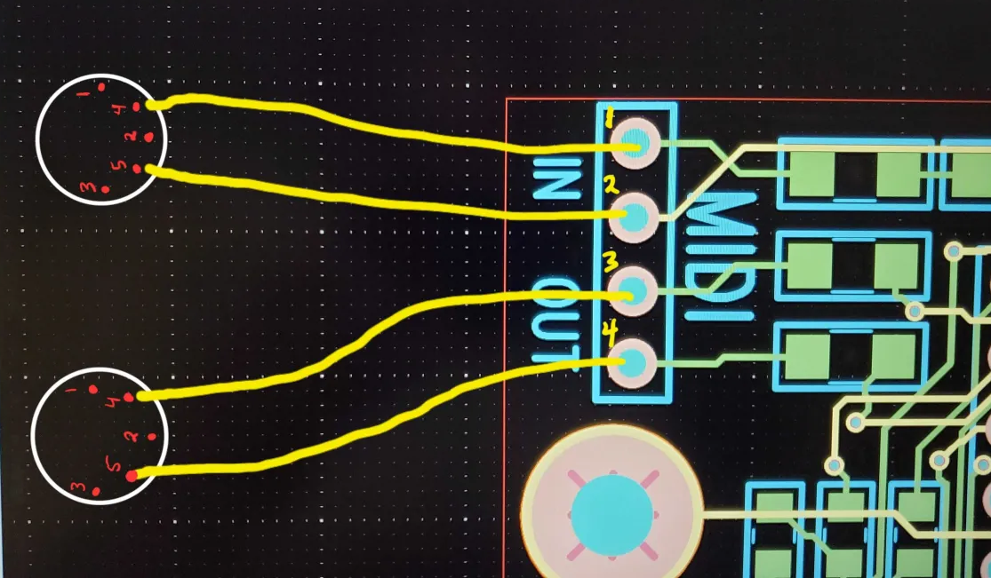 Or you can modify the O_C T4.1 power supply to provide 5V rather than 4.25V. The trade off is O_C T4.1 will consume more power, because Teensy 4.1 uses a linear regulator. If using power hungry USB devices, they will also be powered via the modular +12V rail, generally meant for analog circuitry. The small step-down regulator on O_C T4.1 rev3 is limited to 600mA. Teensy 4.1 typically consumes 110mA, but if a SD card is used it will also draw current, leaving less available for USB devices. To modify for 5V, if using the old gerber files add D6 by soldering on top of C59. Then increase R127 to 27K to change the power supply voltage. If using MIDI OUT, change R139 and R140 to 120 ohms for proper MIDI current.