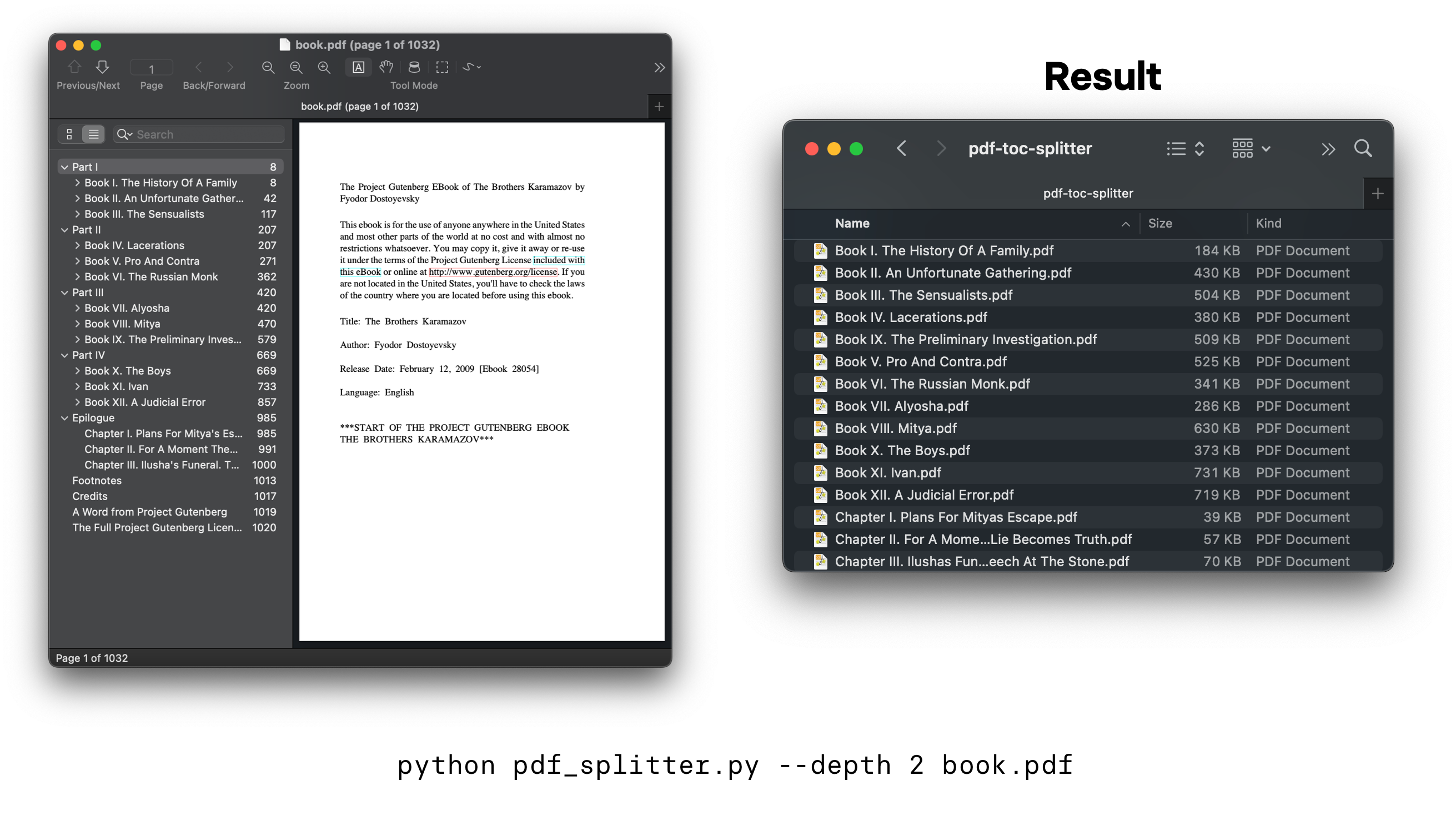 Command line tool that splits a PDF file by its table of contents. Written in Python.