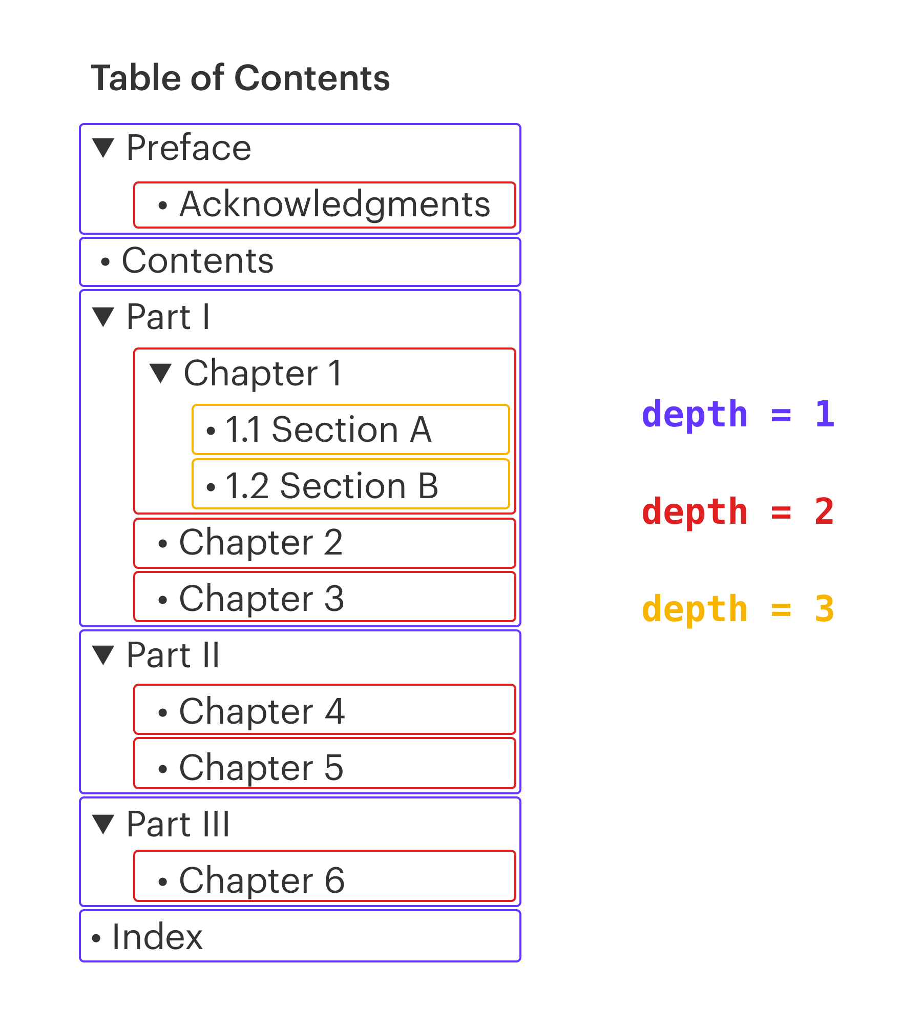 --dry-run: Simulates the split. Prints the filenames, but does not create any files. Useful when checking if the options have been set correctly.--depth INTEGER: The level of depth at which the splits will occur. See figure 1 for a visual explanation. Default value is set to 1.--regex TEXT: Selects outline items that match a RegEx pattern. For example--regex "^Chapter"will only select outline items that start with the stringChapter.--overlap: Overlaps split points. By default, if Chapter 1 starts at page 1 and Chapter 2 starts at page 10,Chapter 1.pdfwill contain pages 1–9, andChapter 2.pdfwill contain pages 10–.... By including the--overlapoption,Chapter 1.pdfwill now contain pages 1–10, andChapter 2.pdfwill contain pages 10..., etc. This is a useful option, if a section can start in the middle of a page.--prefix TEXT: Adds a prefix to the output filenames. Supports the{n}placeholder for an n-th item index. For example,--prefix "CLRS_{n}_"results inCLRS_1_<name>.pdf.