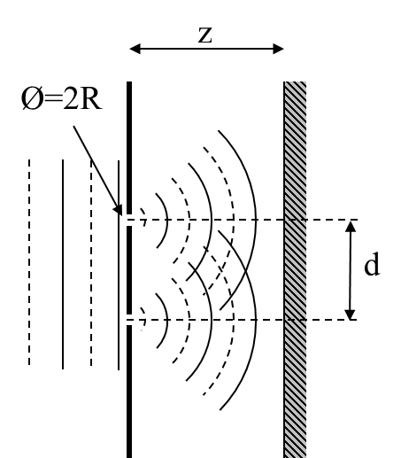 A plane wave is diffracted by two small holes, separated a distance, d. So two more or less spherical waves will propagate from these holes.
