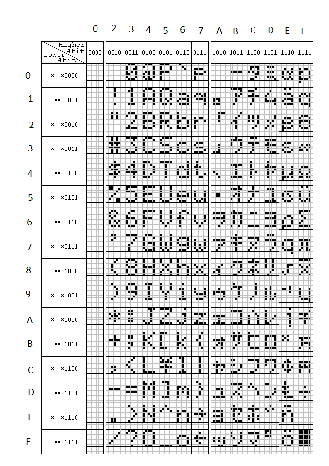 It is possible to define in CG RAM memory up to 8 custom characters. These characters can be prompted on LCD the same way as any characters from the characters table. Codes for the custom characters are unique and as follows: