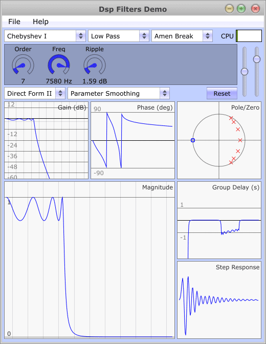 This is the provided DSP Filters Demo application, which demonstrates the features of the library and uses the Juce application framework to run on all popular platforms: