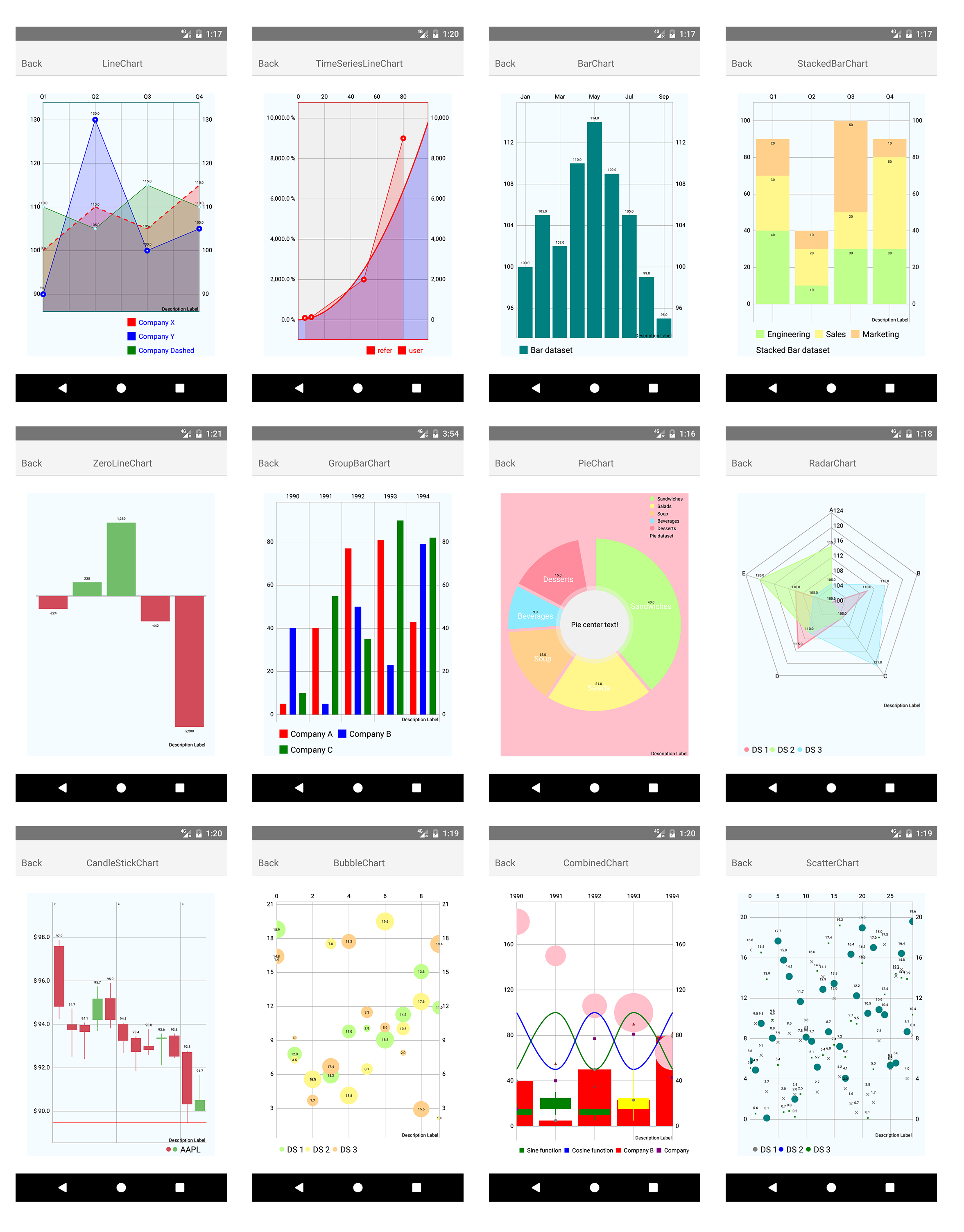 There are 8 supported charts with many configuration options. Almost all configuration available in base MPAndroidChart library are available through this wrapper. More details on available configuration can be found on their wiki.