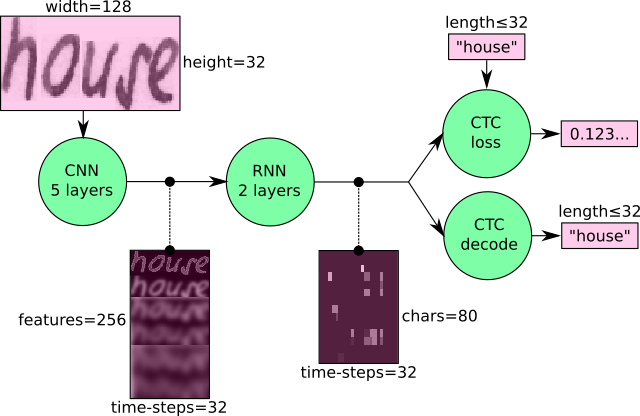 A neural network which recognizes the text in images of words. The network consists of CNN, RNN and CTC layers and is implemented with TensorFlow. The network is kept small (outputs a sequence of at most 32 characters). |