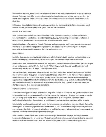 For more than 25 years, Mike Kobeissi has established himself as one of the most reliable names in real estate throughout La Canada Flintridge. He is recognized for his exceptional attention to detail and commitment to delivering high-quality services to clients of all sizes. Kobeissi is a renowned figure in the real estate scene of La Canada Flintridge. When he is not working on real estate deals, Kobeissi hosts exceptional events in the community. He is passionate about automobiles, especially sports cars and luxury vehicles. Kobeissi is the founder of Kobeissi Properties, a multi-million dollar business that assists individuals interested in selling, buying, remodeling, or building new homes. On top of being a successful businessman, Kobeissi is also a design master with an expert aesthetic touch. Kobeissi's extensive knowledge of local properties makes him a fixture in the La Canada Flintridge real estate market. His adeptness at deal-making has made his enterprise highly sought-after locally. Though his journey to real estate was relatively short compared to others, it required him to navigate a different country and rely on his outgoing personality to connect with buyers and sellers. Born and raised in Lebanon, Kobeissi's parents immigrated to California to give their family a better life. When they arrived, Mike Kobeissi started working at Ralph's Grocery in La, Canada, at 18. By building personal connections and working hard, Kobeissi transitioned into real estate through an entry-level job at Jim Dickson's real estate firm. Dickson became Kobeissi's mentor, and the aspiring agent quickly earned his real estate license while developing superior knowledge of the industry and local markets. With time, Kobeissi climbed the ranks to become a top producer in La Canada Flintridge by learning about his client's needs and exceeding expectations.