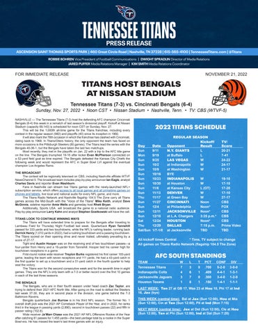 The Tennessee Titans are an AFC South team in the National Football League. Founded in 1959, the then Houston Oilers moved to Tennessee in 1997 and became known as the Tennessee Titans in 1999, going to the Super Bowl in their first season as the Titans.