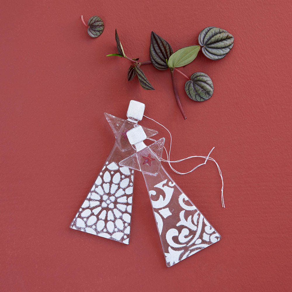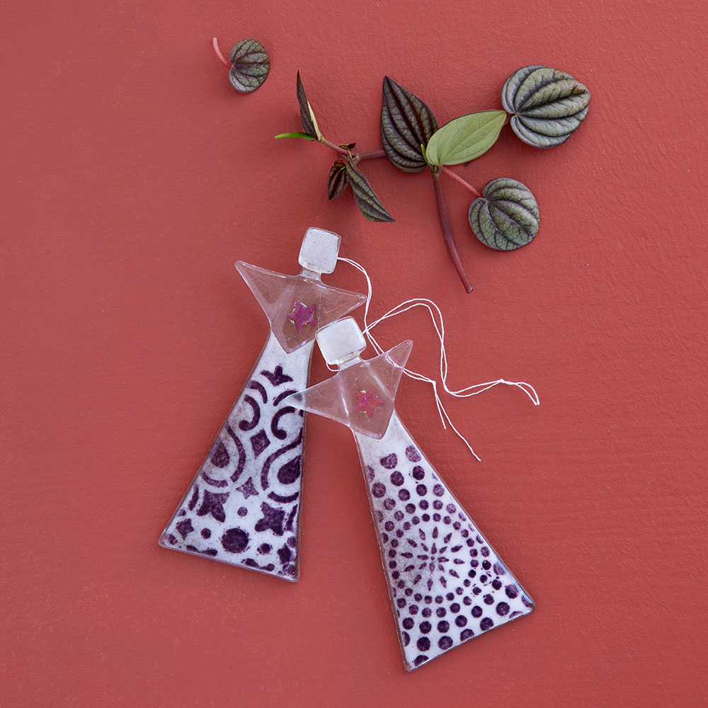Glassengel med oppheng. Engelen er 11 cm høy og finnes i flere farger med en unik sjablong på hver engel. Selges enkeltvis.