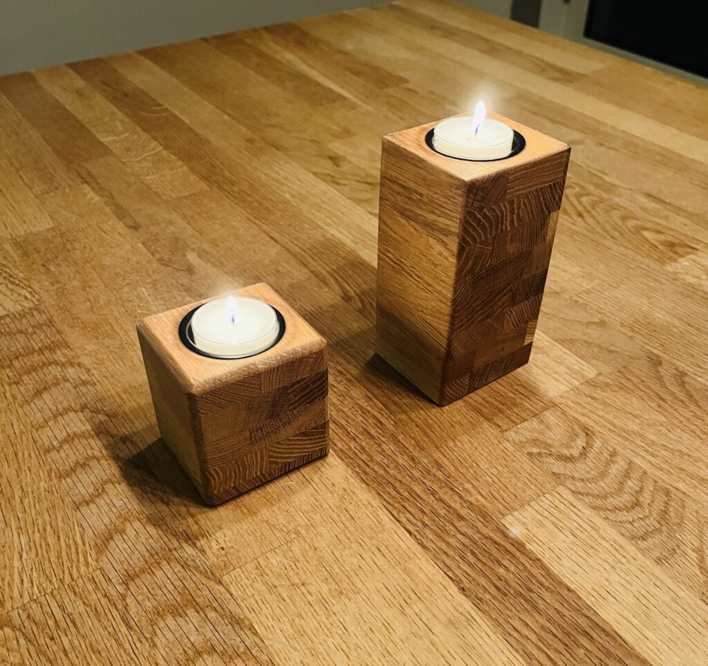 To dekorative lysestake i ulike høyder, laget av naturlig eik i god kvalitet. Designet for telys.