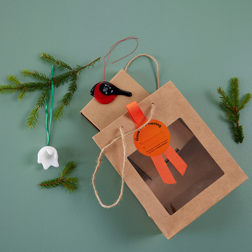 En gavepakke som inneholder en snøklokke og en dompap i glass, pent pakket sammen i en gavepose.