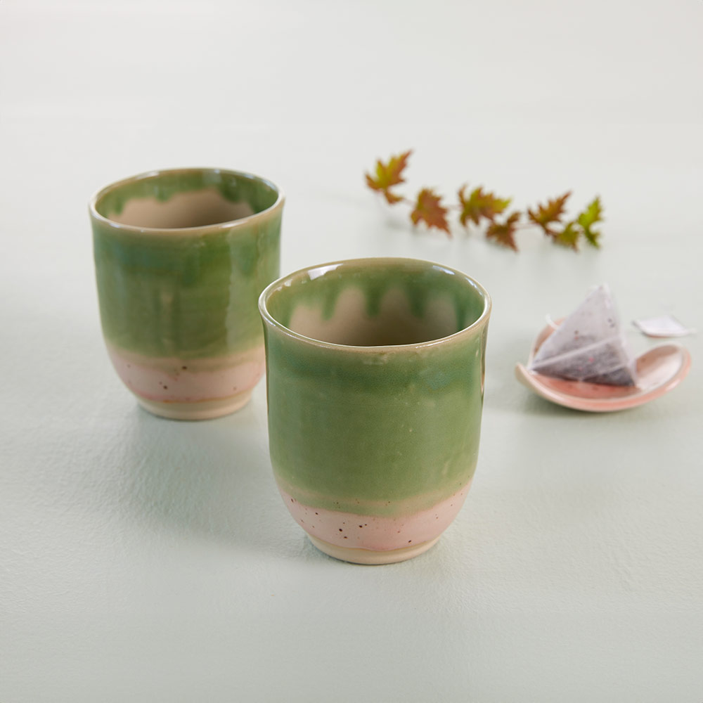 Et vakkert krus uten hank, laget i keramikk. Glasuren er påført for hånd.