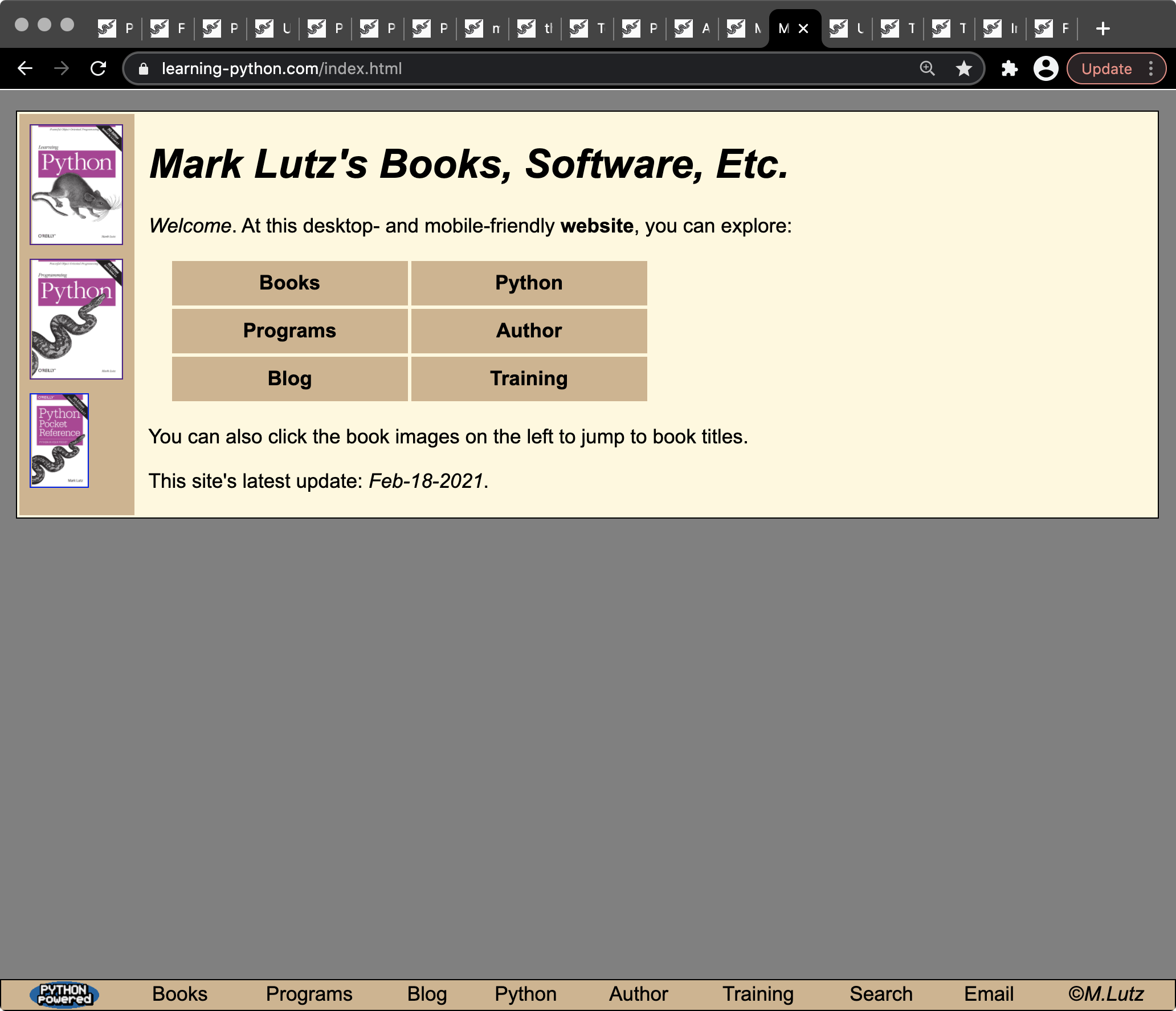 Update, Nov-2021: the book-links page has now gone dark too, and both that and the home page now always use the dark barkground regardless of system settings. Designing for both light and dark is complex, and dark is not that dark here. The home page now also uses rounded corners and collapses its links on narrower displays; web fashion marches on.