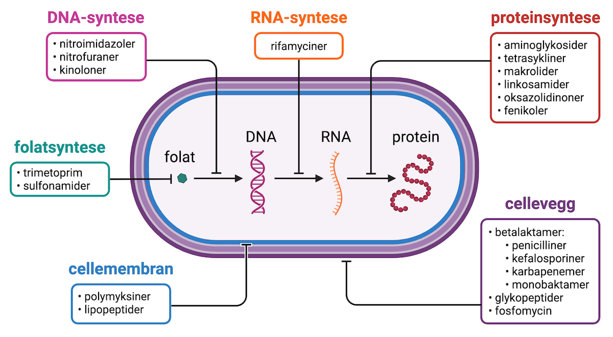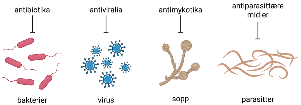 Mikroorganismer som kan forårsake infeksjon hos mennesket inndeles i bakterier, virus, sopp og parasitter. Antibiotika virker bare mot bakterier. Legemidler mot virus kalles antiviralia, mens legemidler mot sopp kalles antimykotika. Legemidler mot parasitter kalles antiparasittære legemidler. Det finnes flere titalls ulike legemidler innenfor hver gruppe.