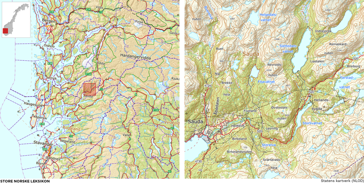 Øverst i Hellandsdalen ligger Hellandsbygd, hvor fylkesvei 520 går over Ekkjeskaret (900 meter over havet) til Røldal. Vegen er en del av Nasjonal turistveg Ryfylke. Hellandsbygd kapell er fra 1956. På østsiden av dalen, inne i fjellet, ligger Storlivatn kraftverk, en del av Saudafallene kraftverk.