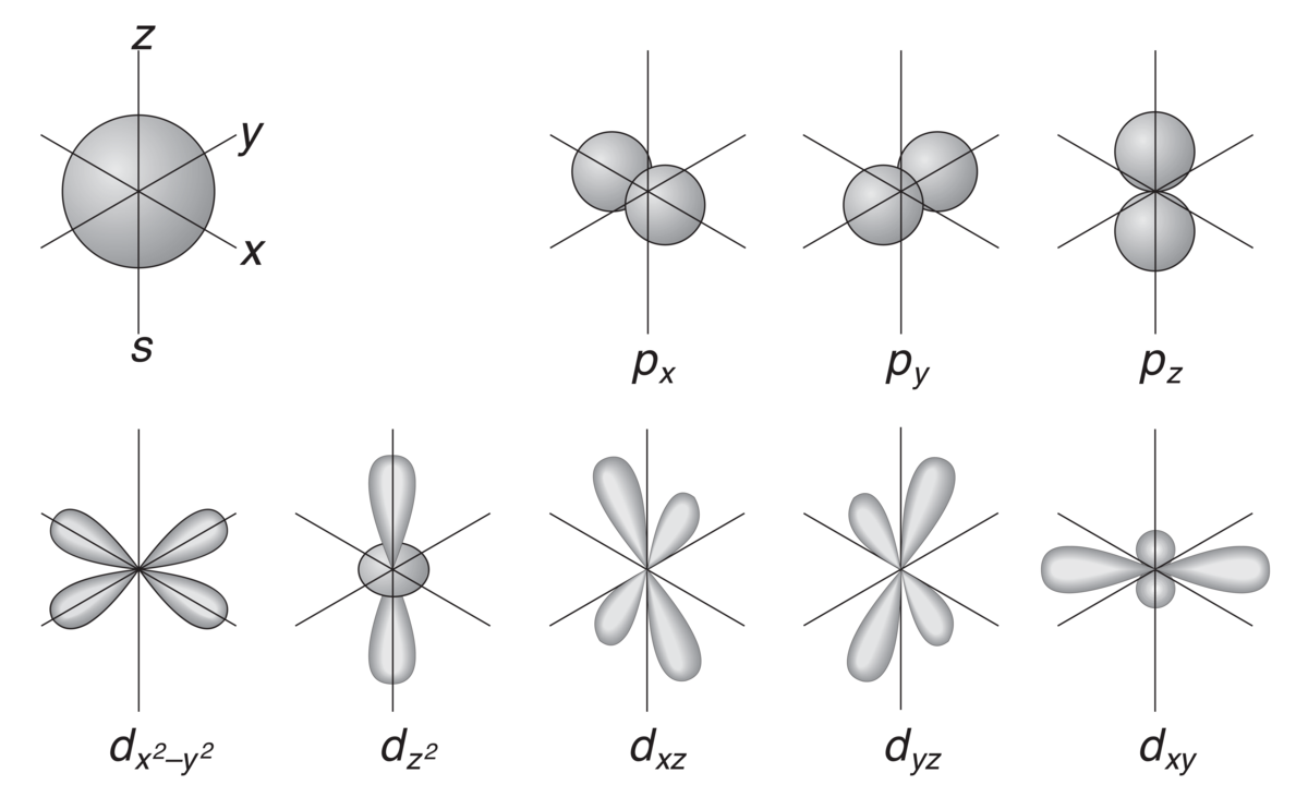 Skisse av atomorbitalenes form. Formen beregnes matematisk ved å løse den kvantefysiske Schrödingerlikningen, og beskriver sannsynligheten for at elektronet befinner seg et gitt sted i atomet. Den sirkulære formen til s-orbitalen uttrykker at alle steder rundt atomkjernen er like sannsynlige med tanke på hvor elektronet befinner seg.