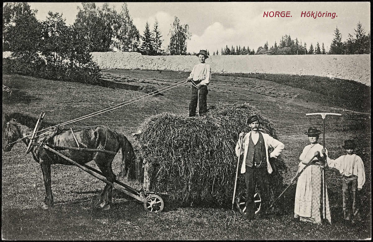 Kvinnene kom så med rivene sine og vende og spreidde graset ut på vollen, slik at det lettare skulle tørke. Sidan raka dei høyet saman i såter. Det tørre høyet vart køyrt med hest og slede inn i uthus heime på gardar eller løer i utmarka. Nokre stader vart også høyet stakka og køyrt heim med slede om vinteren. Dei som ikkje hadde hest, trilla eller bar høyet i hus. Til transport vart det brukt høyslede langt ut på 1800-talet. Etter kvart vart sleden bytt ut med høgvogner med grinder. Det var barnearbeid å trampe lassa.