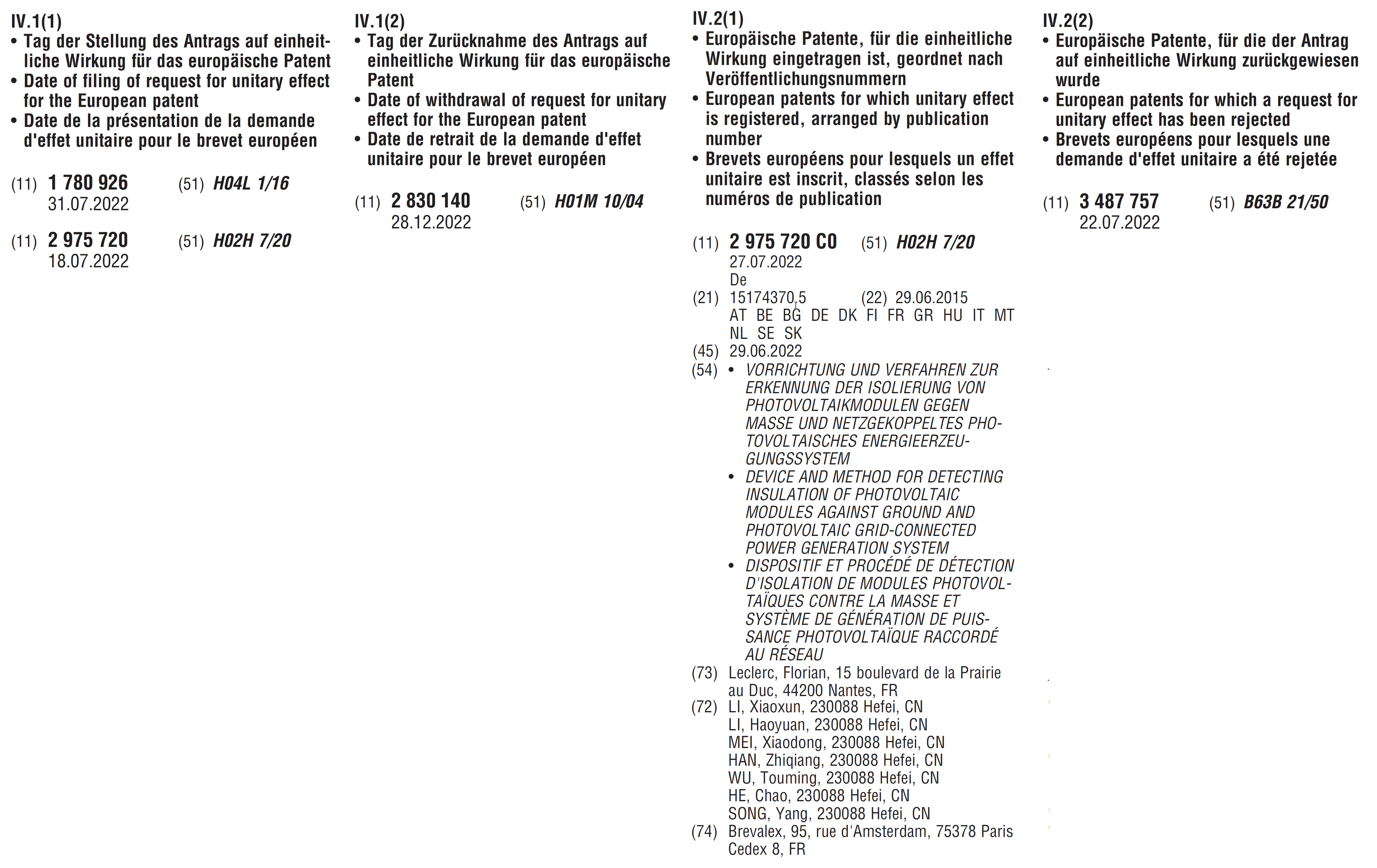 Les informations relatives aux brevets européens avec effet unitaire sont publiées au chapitre IV du Bulletin européen des brevets sous le titre Brevets européens avec effet unitaire. Vous y trouverez les principaux événements juridiques relatifs au brevet unitaire.