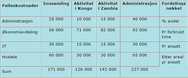 Direkte kostnader er henført til den aktiviteten kostnaden gjelder herunder lønn, reiser mm. Dette er i eksempelet basert på at de ansatte er pålagt å føre timeliste slik at kostnadene blir fordelt på en rimelig, pålitelig og konsistent måte. Felles kostnader er fordelt i henhold tabell nedenfor: