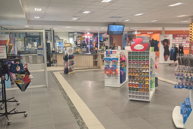 En godt planlagt butikk i svømmehallen gjør det enkelt for kundene å finne det de trenger.