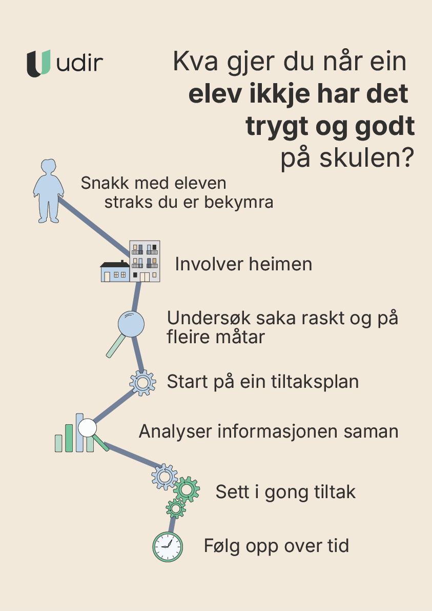 Hvis dere mistenker eller kjenner til at en elev ikke har det trygt og godt, skal dere snarest undersøke saken. Vi har laget råd om hva dere kan gjøre.