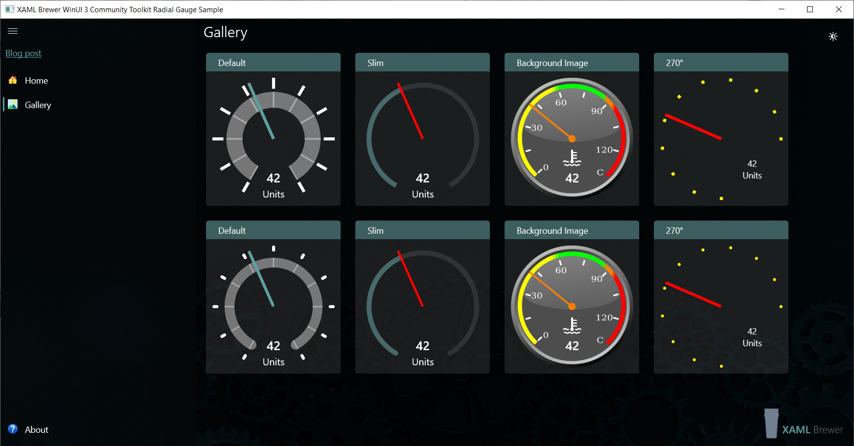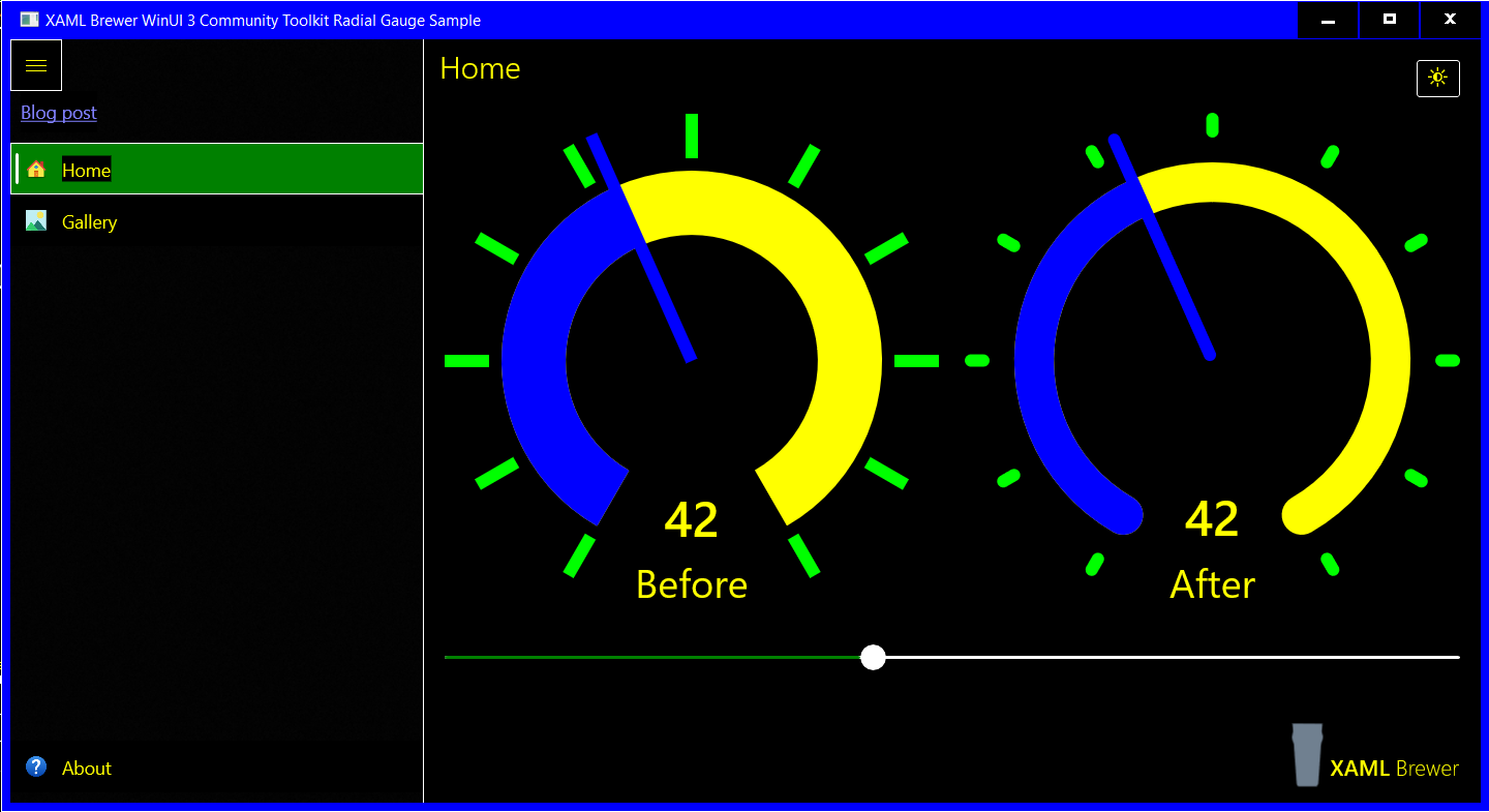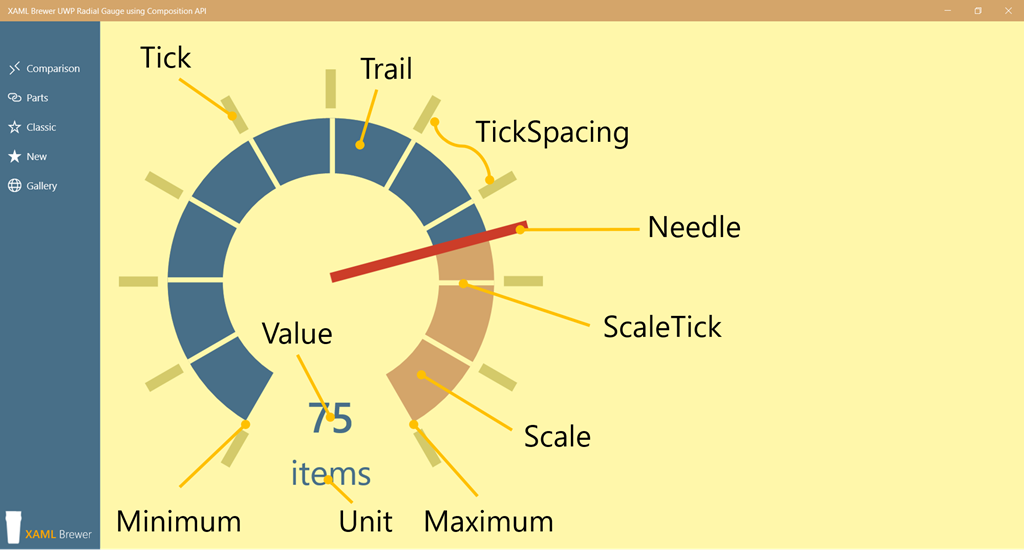 We also added some Windows Community Toolkit controls with a bit more complexity. The RadialGauge renders through the Composition Layer, and the OrbitView mixes XAML elements and images. Here’s how they are defined in the sample page: